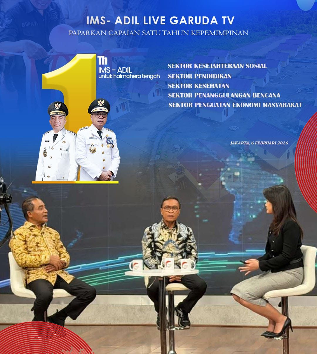 Bupati Halmahera Tengah Ikram M. Sangadji bersama Wakil Bupati Ahlan Djumadil tampil sebagai narasumber dalam program Ekonomi 8 Pagi yang disiarkan Garuda TV. Wawancara tersebut berlangsung di Studio Ring 1 Gambir, Jalan Medan Merdeka Timur, Kecamatan Gambir, Jakarta Pusat, Jumat 6 Februari 2026.